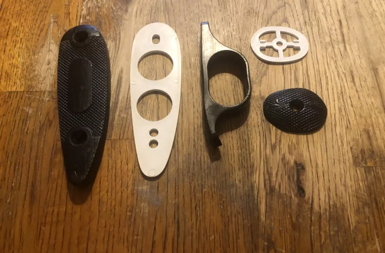 Mossberg Model 640 RC Rifle. Butt Plate,Pistol Grip Cap & Trigger Guard. Cal. 22 Mag. There is alsO the 2 spacers for the Butt Plate & Pistol Grip Cap.