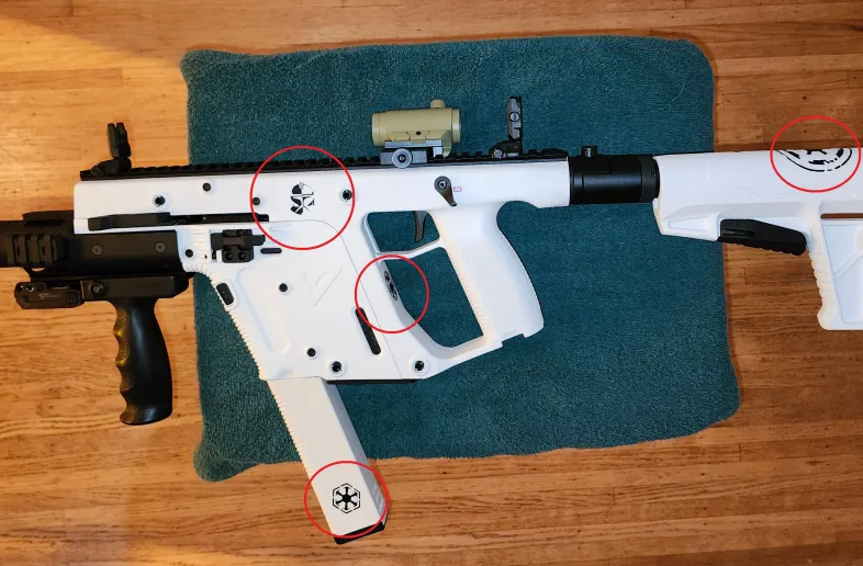 These vinyls are custom made for you, great for firearms, paintball/airsoft, cars, windows, laptops, gifts, anything really. I've attached photos of my Stormtrooper/Empire vinyls on one of mine (yes, the empire symbol on the buttstock is supposed to look "distressed", it is not worn out). Almost all colours are available. Price depends on size and complexity, generally $10+. Please contact for requests.
