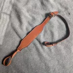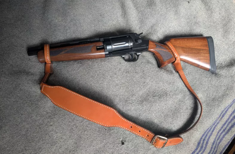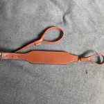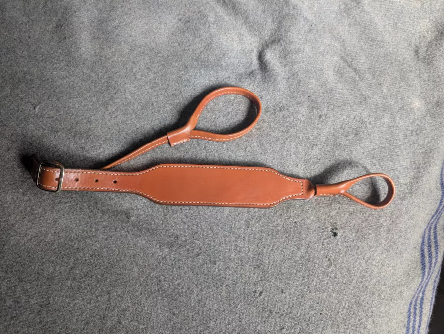 As new condition saddle-stitched top grain leather sling with brass buckle, universal sliding loop style attachment won't scratch firearms. Approximately 38-40 inches at longest setting.