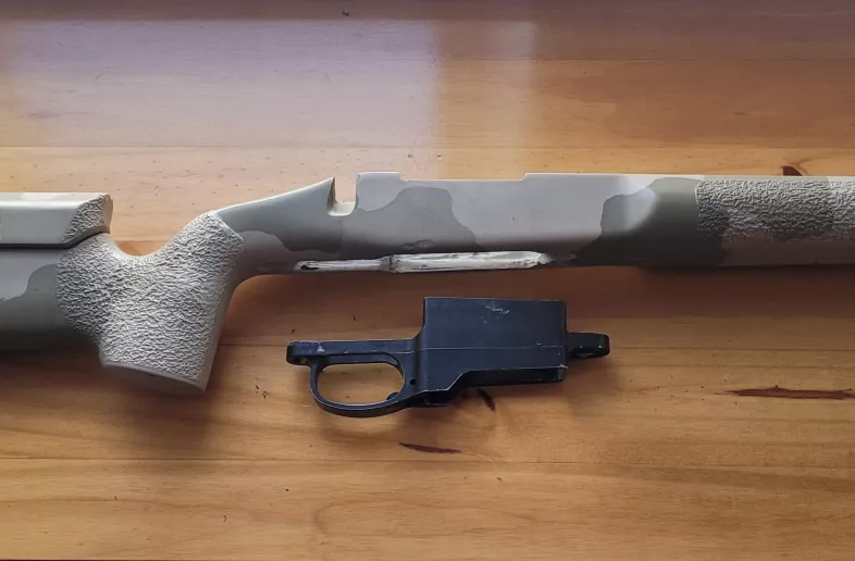 barrel channel has been opened to to accommodate a larger barrel diameter has clear stock tape on buttstock to track in a rear bag to shoot free recoil or close to that.