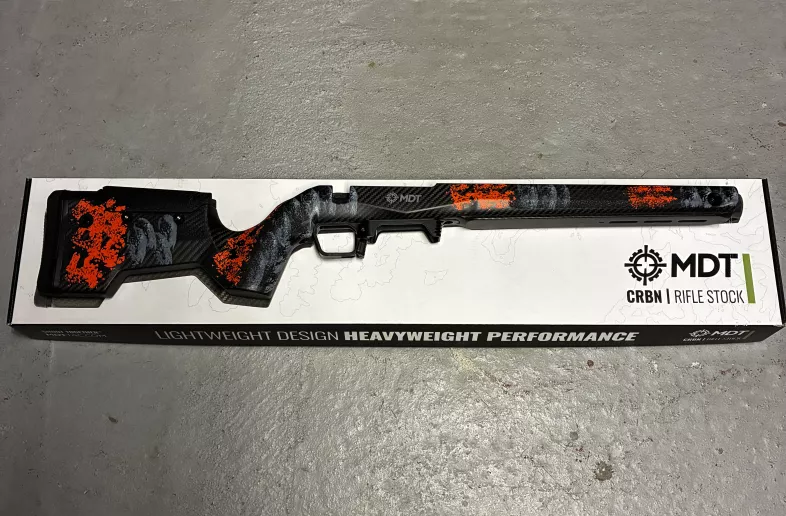 In new condition CBRN carbon fiber stock from mdt in the hunter orange colorway. Includes the competition bottom metal. 700 short action(SA).