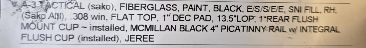 This stock was purchased for a project that never materialized. It is a McMillan A3 Tactical stock for Sako actions. This is a flat top stock that can be inletted and fit to pretty well any Sako action. They all use very similar tang geometry and pillar effective height. The build sheet specifics are pictured. Paid $1200 + Tax. Asking less than half price $499.