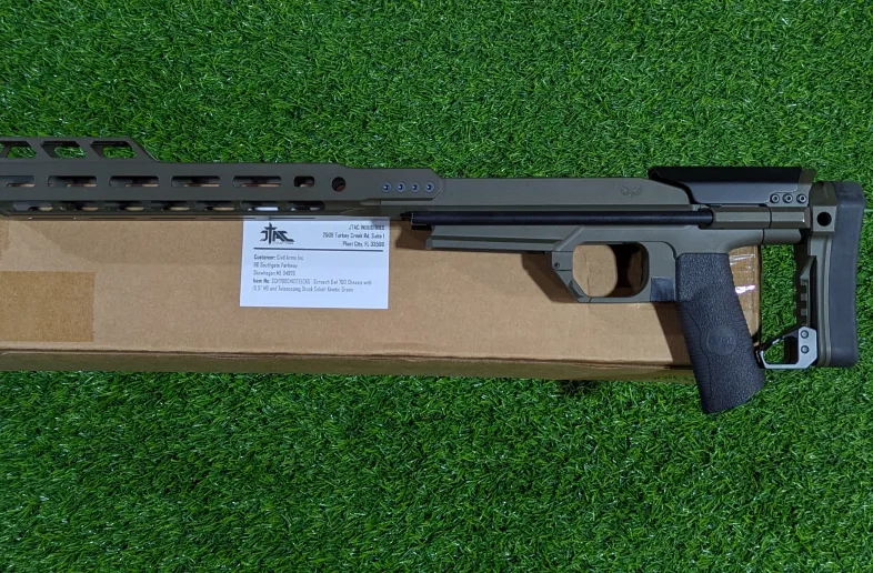 JTAC Industries Screech Owl 700 Chassis right handed in Cobalt Kinetic Green in excellent near new condition (don't mind the electrical tape it's just holding in the action screws). 10.5 inch handguard has mlok at 3-6-9-12 positions, dual integrated QD sling sockets, and integrated ARCA rail. Includes mini-bag rider and ERGO Shines grip which works perfectly with the mini-bag rider allowing full closure of the telescopic buttstock. Fits all Rem700 and clone short actions.