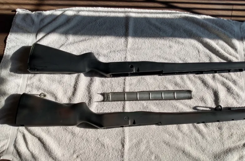- 1 stock has no hardware and the other stock has full hardware with pic rail