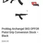 The Archangel OPFOR AASKS conversion stock for the SKS rifle and carbine offers the convenience of a pistol grip stock with an adjustable length of pull and adjustable cheek riser. The forend is aggressively contoured for positive weapon control. An ergonomically correct pistol grip with grooved and textured front There is a locking storage compartment in the grip. The four position collapsible stock features a seven position adjustable cheek riser, and a four position length of pull and is equipped with a removable soft rubber recoil pad. Three steel, QD hard points are embedded to accept QD style sling swivels (sling swivels not included). Constructed of our legendary high strength, carbon fiber and glass reinforced black polymer, the stock super tough and will with stand a lifetime of hard use. Lifetime warranty. comes with x1 archangel 35rd mag pined at 5. $300