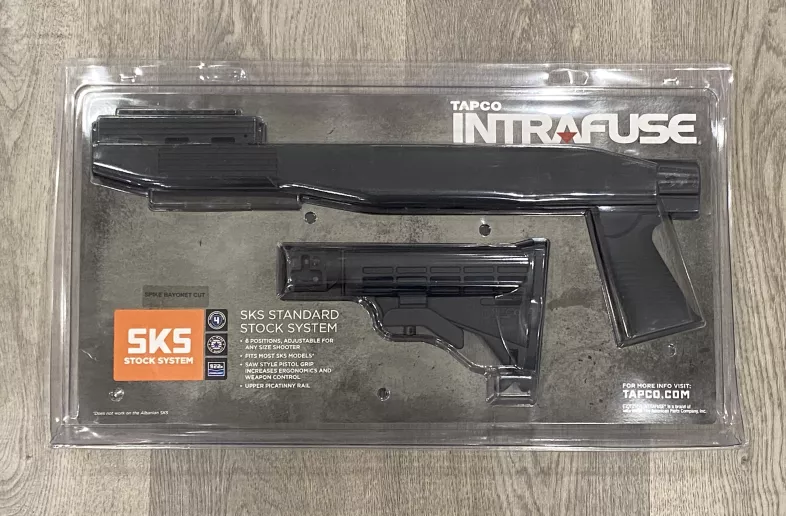 Tapco's Intrafuse SKS Rifle System replaces all original stock components with a high strength composite material. Offering six adjustable positions, this stock will accommodate any size shooter. The Intrafuse SKS Stock System includes an upgraded handguard with built-in Picatinny/Weaver rail. Also included in the kit is the popular SAW pistol grip featuring a more ergonomic angle and increased width for greater comfort and control. Inside the grip housing is a useful storage compartment. Fits most SKS models.
