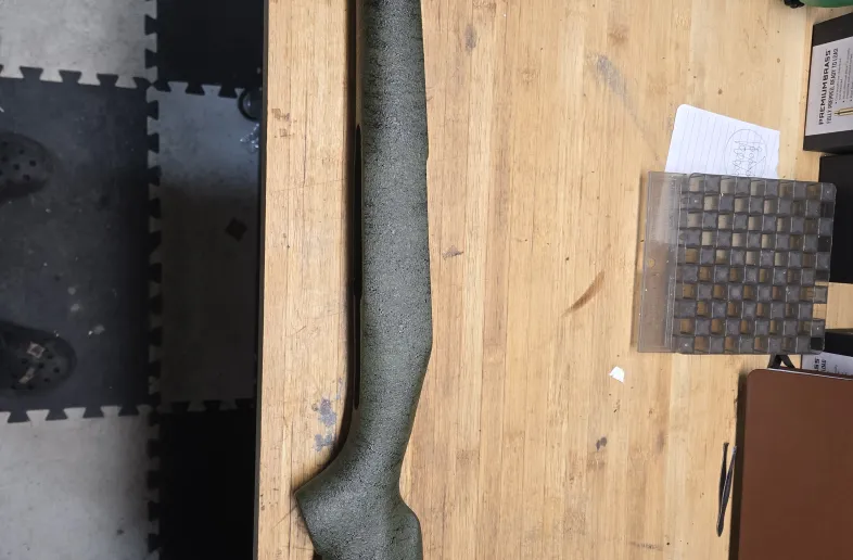Has some bedding from the previous rifle it was on.