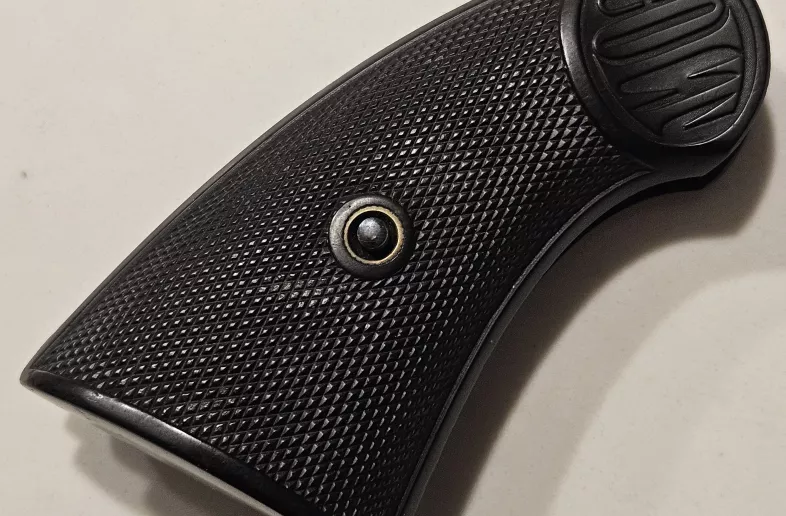 Set of grips w. screw taken off an antique Colt New Army/Navy model 1889/1892, it's the checkered hard rubber grips with "COLT" in an oval at the top, in excellent condition, not chipped or scratched like so many out there. Local sale Southern Manitoba/Winnipeg only. 140, first with cash takes them home, no trades. (204)290-9085