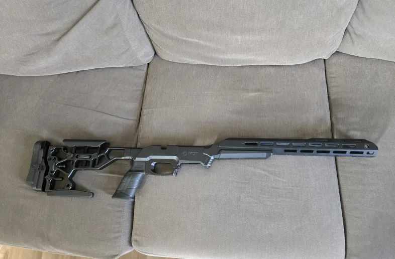 Mdt Tikka T3X short action chassis. Includes all parts pictured. 15 inch for forend, ess center chassis (xtn interface), adjustable ess stock with mdt bag rider, and elite mdt grip. Has all mounting hardware and action screws.