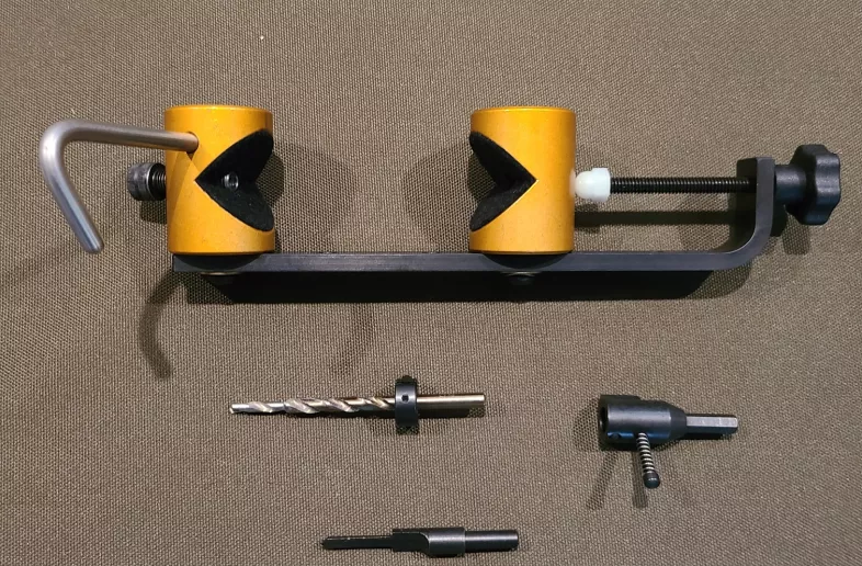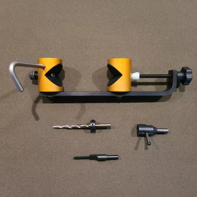 Precision adjustable jig maintains the proper drill bit alignment to ensure the correct location of the rear swivel stud hole. Fits any size stock and automatically self-centers for perfect stud hole alignment. Felt lining prevents marring finished stocks. Includes 5/32” diameter carbon steel drill bit with a special relief tip to help prevent wood splintering and break-out when drilling. Adjustable drill-depth indicator prevents drilling too deep and ruining the hole. For use with a hand-held drill.