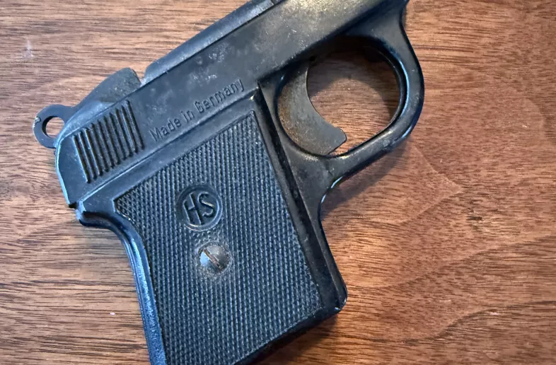A Herbert Schmidt single starter pistol. Holds a single .22 cal blank cartridge. The hammer pulls back and fires no problem.