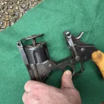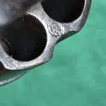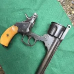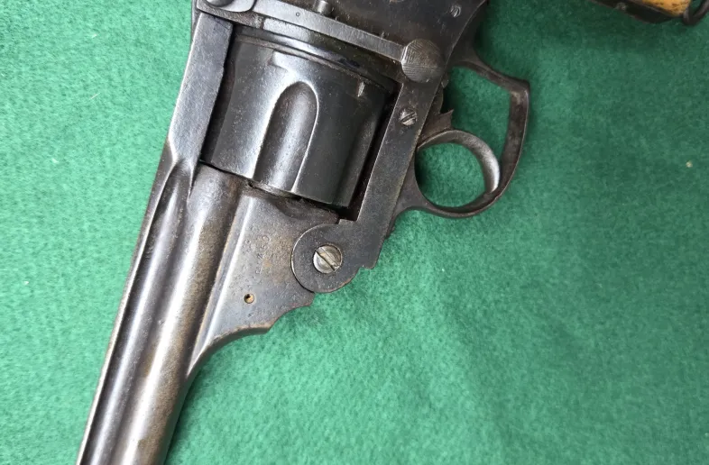 I have an antique status top break revolver for sale in 450 cal. This revolver was made in Belgium before 1893 as the stamp ELG in an oval on the cylinder shows. The left side of the barrel assembly is stamped CAL. 450. This revolver uses The Pryse patent which had a pair of levers on each side which engaged the top strap on closing to lock it shut. The levers snap into to places a d lock the frame shut tight . The revolver works as it should indexes and locks up well in single and double action but I have not shot it. The ejector works well ejects and snaps back into place as it should. The bore has deep well defined rifling with the typical roughness... will clean up better. The metal is smooth grey black overall with some very light pitting in a few places see pics. The grips are in fine condition made from bone or ivory. A nice looking Top Break revolver for half the price as others seen