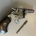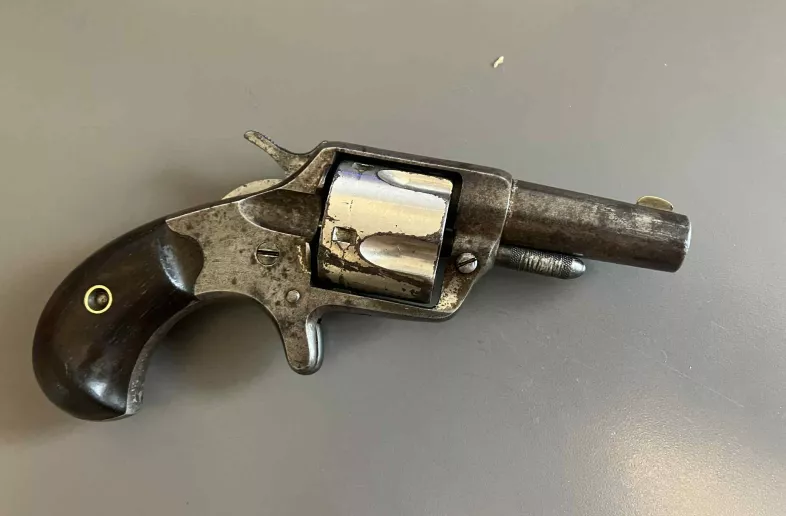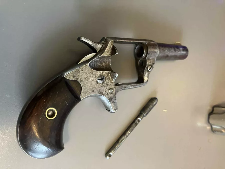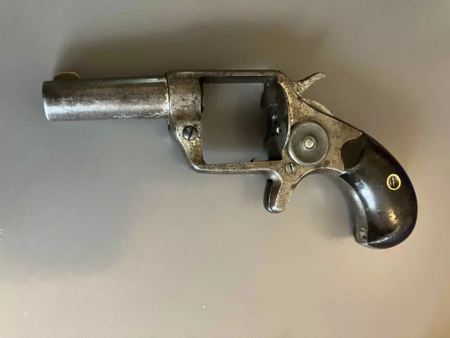 This is the harder to find .41 rf colt newline. This ones finish has seen better days, the cylinder stop is a little stiff but it does function and lockup. The cylinder has aprox 1mm of play with the hammer pulled, no half cock function. The bore is actually in pretty decent shape, dark with visible rifling. This might be a nice project if you like tinkering with these colt newlines. Would probably be fine to shoot as is but I am not an expert, I would have it checked by a gun smith.