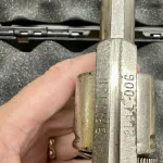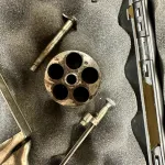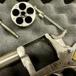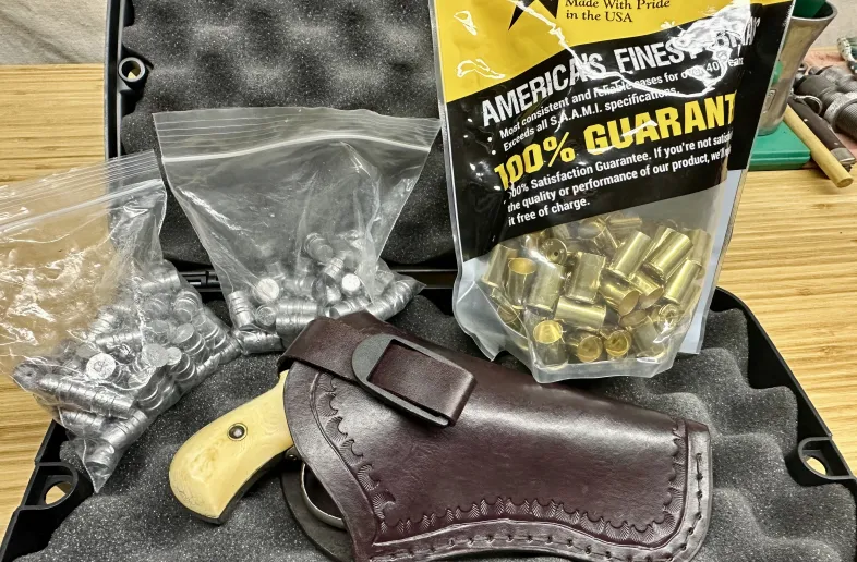 It’s in .44 webley which can be made from .44 Russian brass. As you can see though, it comes with brass, lead and a nice holster. For a local Calgary sale I have 15 rounds made up which I will sell for $60 (sorry, can’t ship the ammo).
