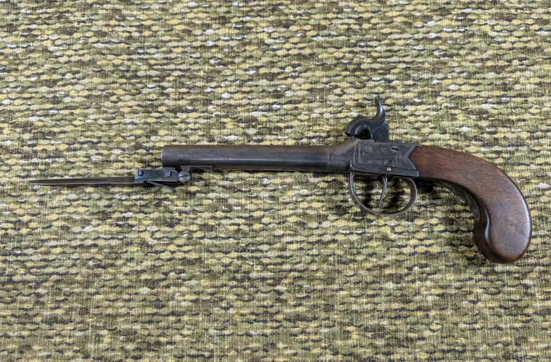 You there sir or madam! You wouldn't want to travel these dangerous streets without some form of protection under your coat! Have a look at this and turn off barrel pistol with a switchblade bayonet for backup, made by Mr. Nock. You may need it should you encounter any rowdies!