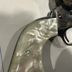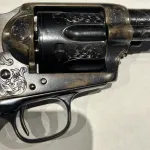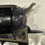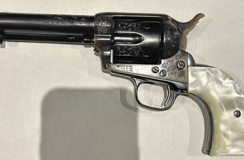 absolutely, beautiful refinished and engraved Colt single action army chambered in extremely rare 44 Smith & Wesson, which also chambers 44 Russian. Manufactured 1883. Excellent mechanics with four clicks. Mild side to side rotation of the cylinder, but it aligns perfectly. has very good rifling with mild frosting. Beautifully engraved, and gorgeous color case hardened finish. faux mother of pearl grips with real abalone left screw hole olug. comes with antique status letter from RCMP.