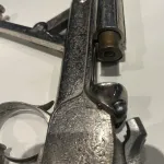 This is a fine example of the sliding opening system with its underlever that is lowered to both move the barrels forward and concurrently extract the spent cartridges. This pistol is marked with the known gunshop name Franchi in Montevideo, Uruguay, which sold several variations of these unique pistols.