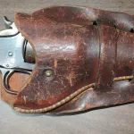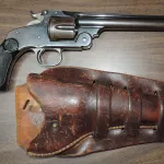 This is an early beautiful Smith & Wesson New Mod.#3 chambered in the popular .44 Russian. Much of the original blue remains as does case colour hardening on the hammer. The chambers on the cylinder are very good and though the rifling is strong, the barrel shows some black powder rippling but no major pitting. This should be an excellent shooter and it is mechanically perfect with 3 strong clicks when set into battery. It comes with a scarce and period correct Heiser holster which is collectible in itself.