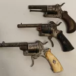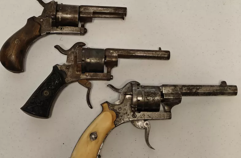 None of these are functional. The one with the ivory grips is probably the closest. All are missing some hardware and parts. The bottom two partially index. Only the one with ivory grips has a rifled barrel.
