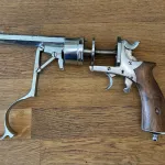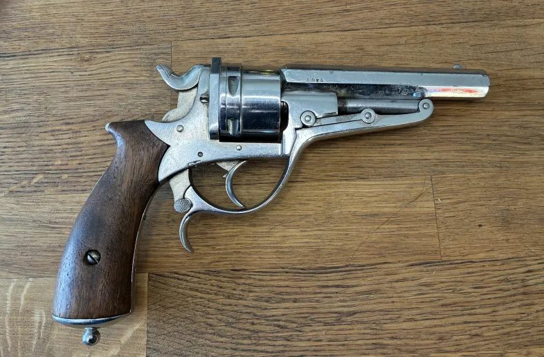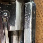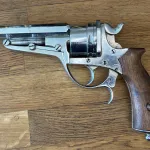 An obviously refinished revolver, with beautiful walnut grips that are also obviously not original. There appears to be some sort of perhaps unit marking on the right side of the barrel but I can’t connect it to any known military deployment of the Galand revolver.
