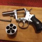 This "British Bulldog" is was optimized for fast, smooth double action and self defense, single action can be also used but not recommended to avoid unnecessary stress on the sprigs. The markings are sharp, and the action is accurate. The loading gate on this one are quite unique and is locking by magnet instead of regular spring. The cylinder indexes and locks up properly. The bore of the 2.5 inch barrel is fine with sharp rifling. Matching serial numbers on the frame and cylinder. The black original grips are excellent and undamaged showing no wear at all. SN 27379, very fine overall.