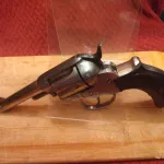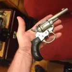 This one is compact version of famous Colt M1877 "Thunderer" was made for self defense and fast action. With short barre and no regular extractor on the side this revolver made for concealed carry and optimized for fast double action. The action is strong and crisp, and the cylinder indexes and locks properly, without any play in the cylinder. The bore of the 3 1/4 inch barrel is very good bright with good rifling. The black hard rubber grips are very good and undamaged. SN 53847.