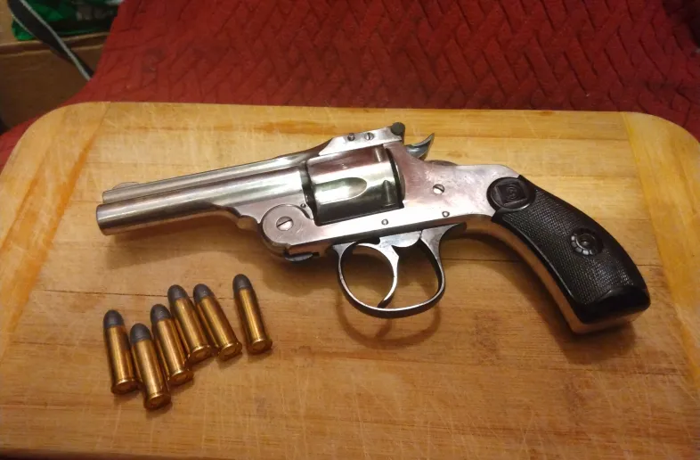 Compact self defense pocket revolver which looks lake miniature copy of Smith & Wesson 44New Model No. 3 Top Break, .44 Russian Revolver