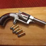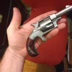 Hopkins & Allen "XL No. 4", .38 RF Pocket Revolver The markings are sharp and the numbers match on the frame, barrel and cylinder. The action is strong and tight, and the cylinder indexes and locks properly. The bore of the 2 1/2 inch barrel is very good, with strong rifling. The rosewood grips are excellent and undamaged, with varnish intact. SN 289, very good overall.