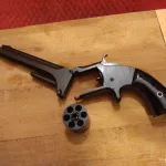 Smith and Wesson No. 2 "Old Model Army", .32 RF Revolver This one is in very good condition. With original blue. The action is strong and accurate, and the cylinder indexes and locks properly without play. The bore of the 5-inch barrel is very good, with sharp rifling and mirror bright. The rosewood grips are very good and undamaged. They look like they may have been re-varnished once. SN 59474, very good overall.