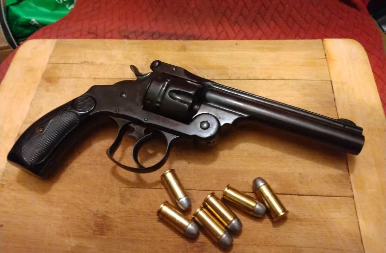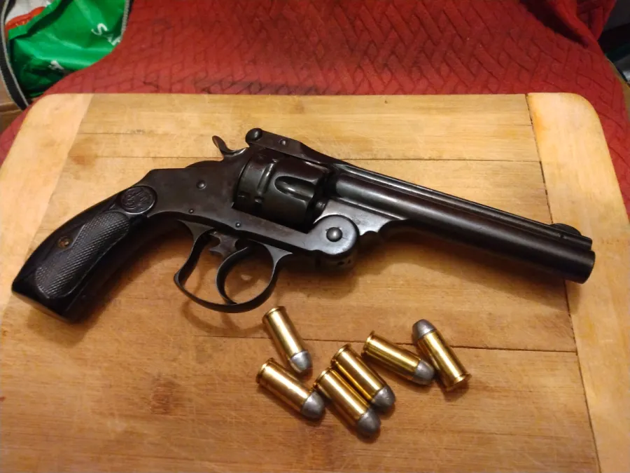 Smith and Wesson's first double action design dates back to at least 1872 - years before Colt ever attempted a double action cartridge revolver. It was mentioned in a letter to the Russian envoy General Orlof, and although the sale to Russia never materialized, it served to pave the way for the very popular and successful line of double action top break revolvers. The .44 Russian model was actually the first to be produced as a prototype, and the last to be released for sale to the public. For this reason there exists a degree of confusion over the proper terminology: the first one to be manufactured for sale was the .38 caliber model, followed by the .32. The .44 caliber model was not released until 1881, and is variably known as the No. 3 Double Action, the Double Action "Navy" (a name Daniel Wesson wanted to keep alive to differentiate this model from the No. 3 single action, and still holding out hope to sell it to the Russian navy), and the First Model Double Action. Originally, the .44 Double Action was made with a 1 7/16 inch cylinder, however an optional .44-40 version was available as of 1886. This required a 1 9/16 inch cylinder, and a longer frame. The firm soon realized that it was too expensive and cumbersome to manufacture two different sizes of frames for what was essentially the same gun, and the shorter cylinder and frame were dropped in faivour of the longer one in the early 1890's. The No. 3 frame .44 double action top breaks were dropped from the Smith and Wesson catalogue in 1913.