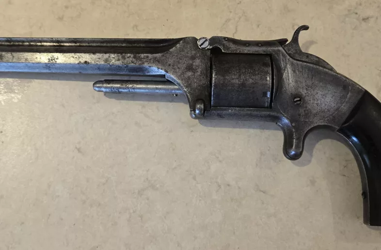 Good condition Smith and Wesson Model 2 Army. Gun is in 32 Rimfire. Very tiny amount of play in barrel to receiver interface, good rifling with some pitting. Indexes well, locks up very well.