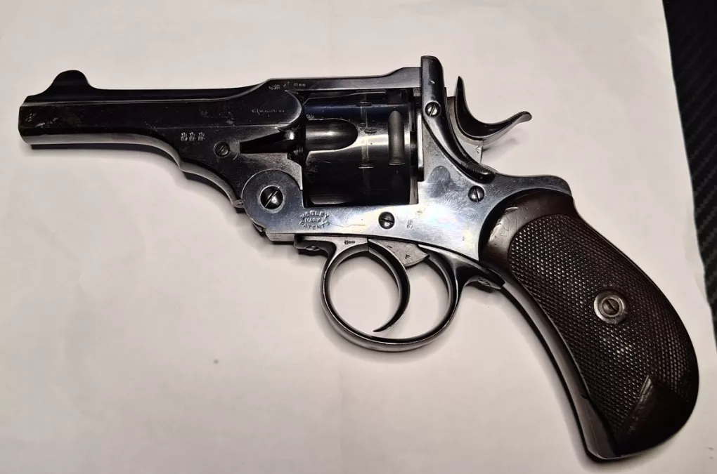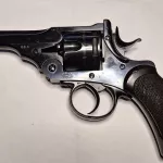 Broad arrow stamped Webley Mark I. Dates between 1887 and 1894, and is rated as an antique. Includes paperwork from RCMP for antique status.