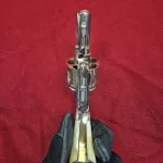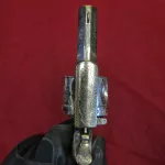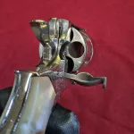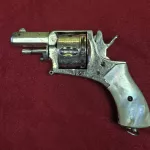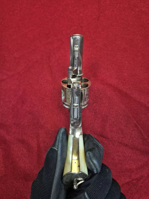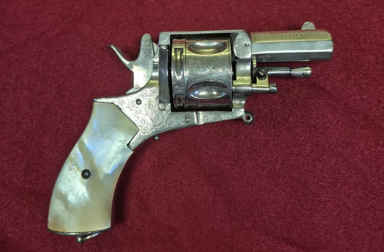 This fancy little revolver is marked "SCOTT LONDON" on the barrel but bears Belgian proof marks, and was made between 1878 and 1893. It is in excellent condition, with 95% plus original nickel plating and excellent, undamaged mother of pearl nacre grips. The action is accurate and the cylinder indexes and locks properly. The bore of the 2 inch barrel is fine, with strong rifling. A very handsome little revolver. SN 15 on the frame, cylinder and ejector. Trigger drops down or folds up, preventing snags.