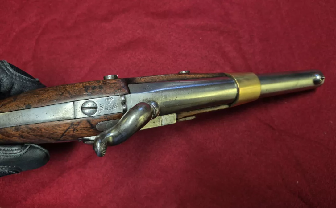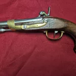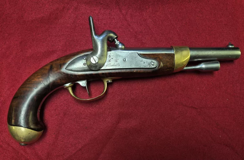 An antique French Charleville 1822 Model pistol converted to percussion. Wood grips are solid and bear original markings. A very nice barrel with iron sights and is in excellent condition overall. A hefty .69 caliber.