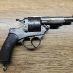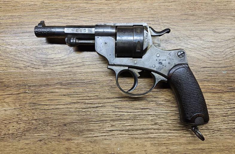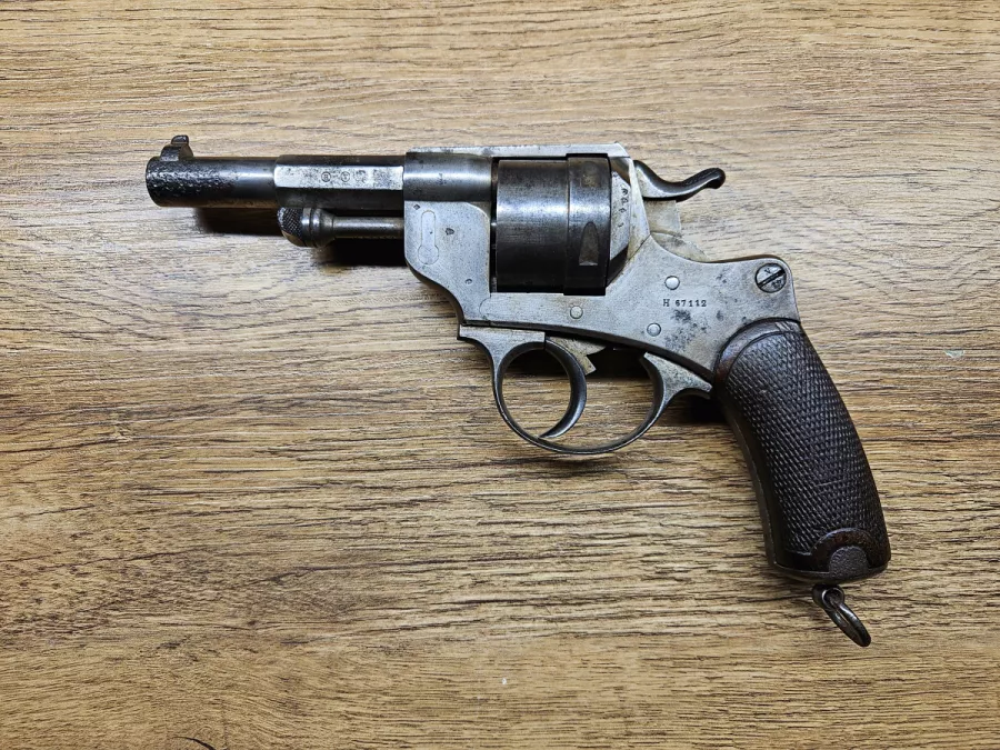 French Model 1873 Service Revolver, manufactured in 1882. Chambered to accept 45ACP handloads and 455 Webley. All French 1873's in original 11mm, 45 and 455 Webley are classed antique status in Canada, no PAL required to purchase or own. Revolver will come with an RCMP FRT printout showing antique status in Canada. 4.5" barrel, 6 shot. The action on this piece functions excellent in single and double action. Timing and lockup are great. Original grips are in good shape showing expected wear, lanyard ring is intact. Areas of exterior pitting on barrel, cylinder. Bore shows very nice and rates very good for the vintage. All serial numbers match. $2150 includes Free Shipping. If you have any questions or need more pictures or video please feel free to ask. Gladly text me anytime at 1-204-392-8152.