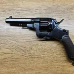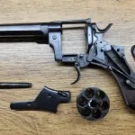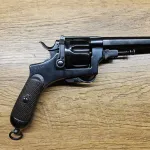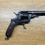 Italian 1889 Bodeo Revolver manufactured by Fabb D Armi in Brescia, Italy 1890. The cylinder accepts appropriately loaded 44 Russian handloads, 4 3/8" barrel, 6 shot. The exterior has been reblued at some point. The stow away trigger system works as designed and trigger drops down for use upon hammer pull. Action is finicky, hence the low price. Double action works but often doesn't cycle cylinder. In single action it cycles the cylinder fine but trigger pull often has a two stage effect where is needs 2 light pulls to release hammer. Sideplate locking screw can loosen at times and there is slight gap at bottom. There is play in lockup. Original grips are in good shape, lanyard ring is intact. Bore and cylinder walls rate good-very good. Interior components/springs appear in good shape so not sure why the issues. $1295 includes Free Shipping. If you have any questions or need more pictures or video please feel free to ask. Gladly text me anytime at 1-204-392-8152.