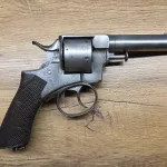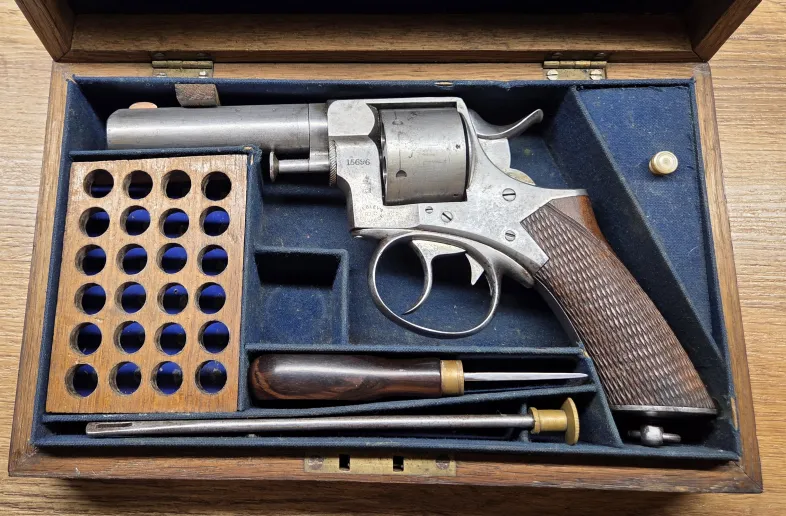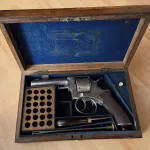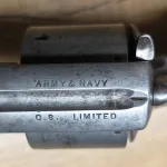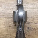 Webley RIC No1 revolver, retailed by Army & Navy CSL, 4 3/8" barrel, 6 shot. Chambered in 450, 455 Webley fits cylinder well. The action on this example functions excellent in single and double action. Half and full cock work well. Timing and lockup are good. Original one piece checkered grip in good condition, lanyard ring is intact. The bore is definitely in above average higher condition and shows very well. The push in ejector rod can be fully pulled out but stays in center pin well with good retention. The old wood case houses the Webley well. Inside is an ivory knob little compartment for cleaning patches, as well there's a high quality screw driver and cleaning rod, the case key is not present. Overall a very desirable cased Webley set! If you need brass, lead or dies please inquire. Antique status in Canada, no PAL required to purchase or own. Will include an RCMP FRT printout showing antique status in Canada. $2850 includes Free Shipping. If you have any questions or need more pictures or video please feel free to ask. Gladly text me anytime at 1-204-392-8152.
