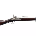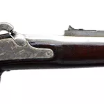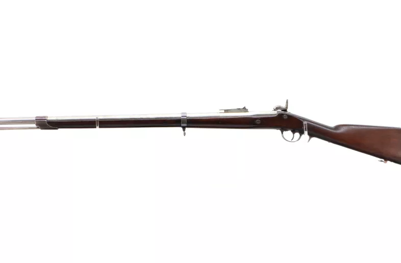 Main Description: Blade front sight, u notched ladder peep sight, tapered round barrel in the white with initials F.C.W VP Eagle Proof mark, dated 1863, colour case hardened lock with Eagle US and 1864 date with checkered spur hammer that functions, nipple intact, uses musket caps. One piece full military wood stock, straight grip, smooth curved steel butt plate, tang marked US, finger rest steel trigger guard, two barrel bands, sling swivels, bayonet lug, steel ramrod, left side of stock around front lock screw bushing is chipped and cracked.