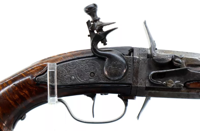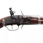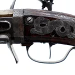 Main Description: This pistol has two barrels which appear to rotate using the trigger guard to unlock them (does not function correctly), no sights, part octagon and tapered round barrels, engraved steel frame and lock with hammer and frizzens that function. One piece wood grip, chipped behind frame, black and white pommel cap, steel trigger guard, ramrod on left side.