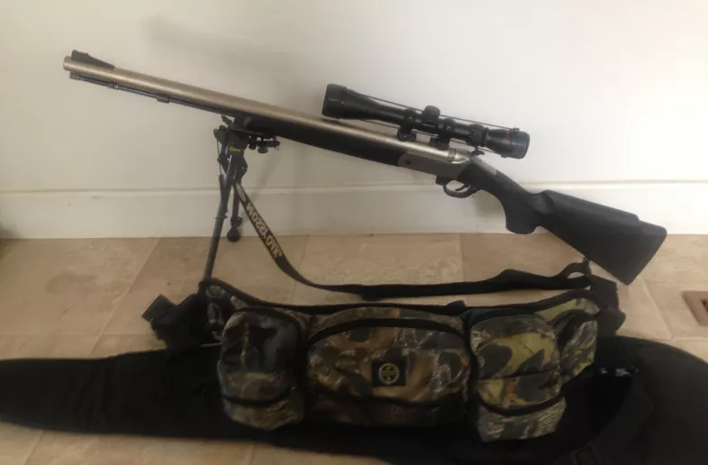 Lightly used like new stainless steel . 3x9 scope and sling and soft gun case. Powder and shells cleaning kit etc included. Phone 306 690 2151 .