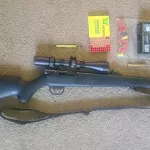 Traditions Tracker. 50 cal, 3-9 Simmons 8 Point scope, 12 - 250 grain sabot projectiles as seen in pictures, 50 -176 grain round balls, 25-350 grain cast lead bullets, 12-250 grain cast lead bullets, a new package of pre lubed patches, 209 primers, 40 triple 7 pellets, caping tool, breech tool, bullet starter, and strap.