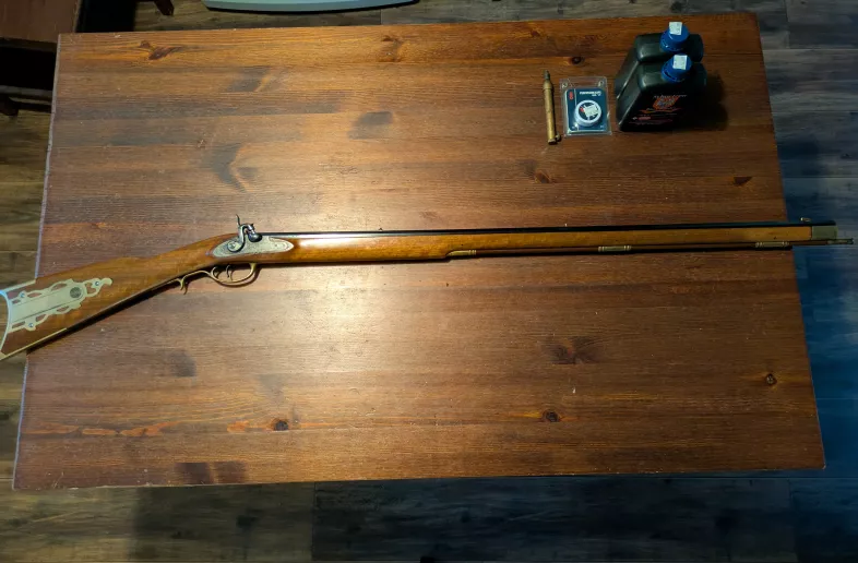 Italian made cap lock Kentucky long rifle, 50 caliber, rifle is in great shape and shoots well, comes with everything needed to shoot, round balls and patches, 2lb of black powder, cci percussion caps, ball starter, cap holder and powder measure