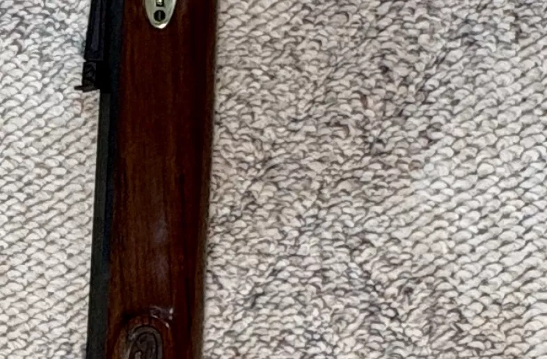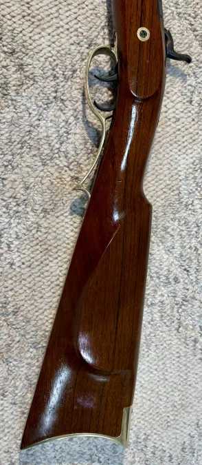 Beautiful brass accented Hawkins style black powder. In excellent condition. Blueing is great, wood is great and the bore is clean. Used but not abused. Comes with an actual powder horn and a powder measure that fits on black powder cans.