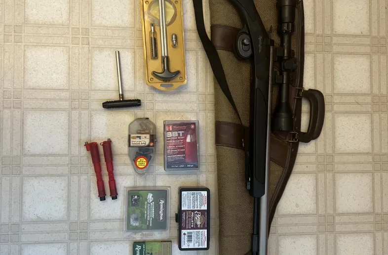 Everything you need. Remington Genesis model I believe 50 cal muzzle loader. Bullets, Wads, Primers, black powder pellets, cleaning kit, two quick loads Bushnell 3x9 scope, trigger lock, padder case, successful deer hunt last muzzle season. Fun to shoot.