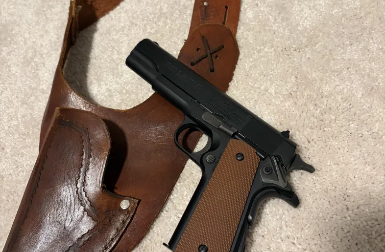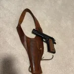 Vintage shoulder holster meant for a colt 1911/ colt 45 & a C02 colt pistol. Unsure if the pistol works as ive never shot it & always used it as a display