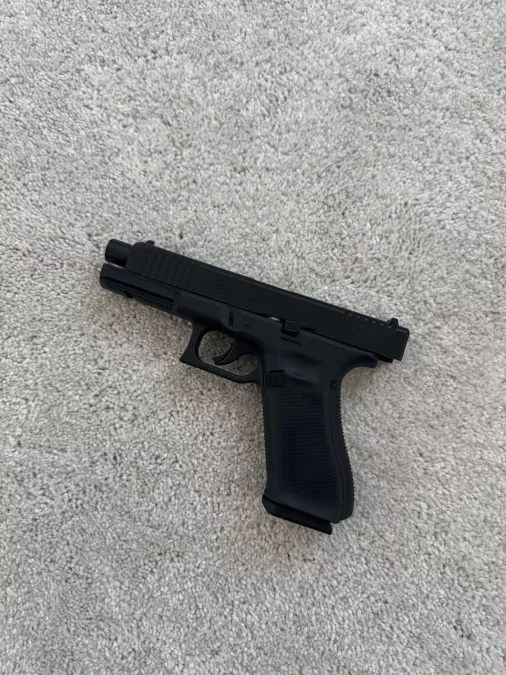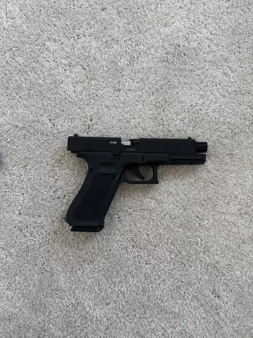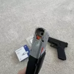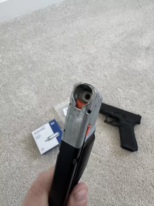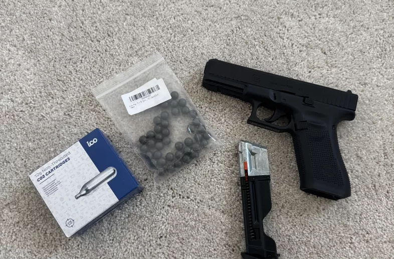 Used only once to plink cans, comes with a Glock hard case that isnt pictured. Price includes the c02 canisters & .43 cal metal rounds. This is a fully licensed product by Glock & is a 1-1 scale of a real 9mm one. Can shoot metal, rubber, paint or pepper rounds. They are used as law enforcement training weapons as the weight & size are exact to the service weapon. No pal required to purchase