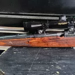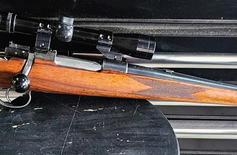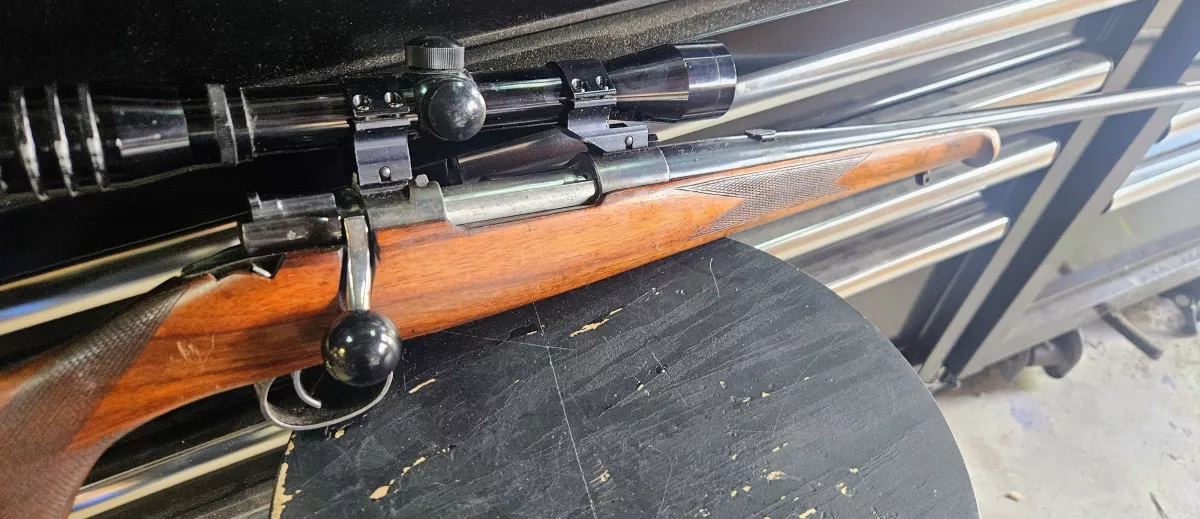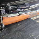 Glass bedded, adjustible trigger, sling studs, and side safety.