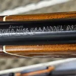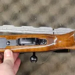 High gloss fancy European walnut stock with sharp cut checkering, palm swell grip, flat bottom, and a Monte Carlo type check rest.