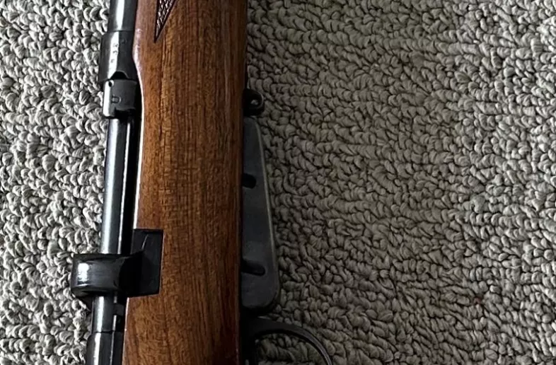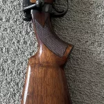 Hand checkered, Monte Carlo walnut stock with a tasteful dark stain finish. Some handling marks on stock.