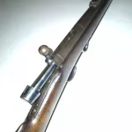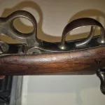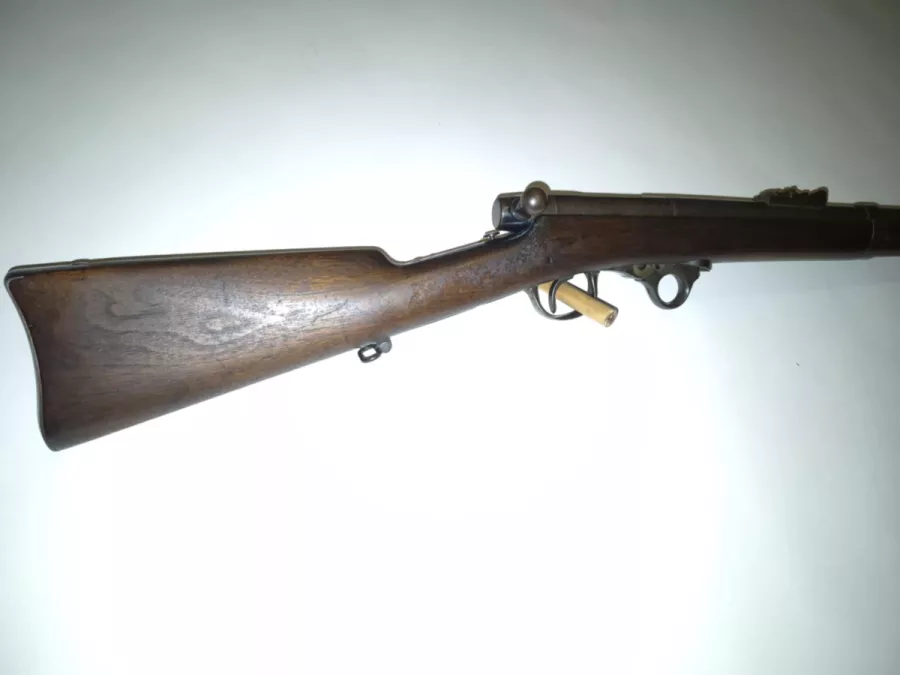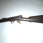 It features an under-hammer ahead of the trigger guard with a machined ring for easy cocking. Its unusual loading system required two bullets: the first served as a gas seal, the second as the projectile. After firing, the remaining bullet was pushed into the bore, followed by powder and a new gas-seal bullet.